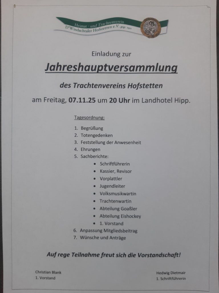 Am Kirchweihsamstag luden wir zum Vereinsabend ins Landhotel Hipp ein. Dabei standen neben Auftritten der Trachtenjugend und der Aktiven Plattelgruppe auch Ehrungen langjähriger Mitglieder auf dem Programm. Besonders zu erwähnen ist hierbei unser Ehrenmitglied Simon Bauer, der uns seit stolzen 70 Jahren die Treue hält. 1. Vorstand Christian Blank dankte ihm dafür in seiner Laudatio ganz besonders. Außderdem wurde unser Abteilungsleiter der Goaßlgruppe Matthias Klöpfer nach 12-jähriger Amtszeit mit einem Präsent offiziell aus der Vorstandschaft verabschiedet. Dazwischen spielte Schöffeldings kleine Blasmusik zur Unterhaltung und zum Tanz auf.